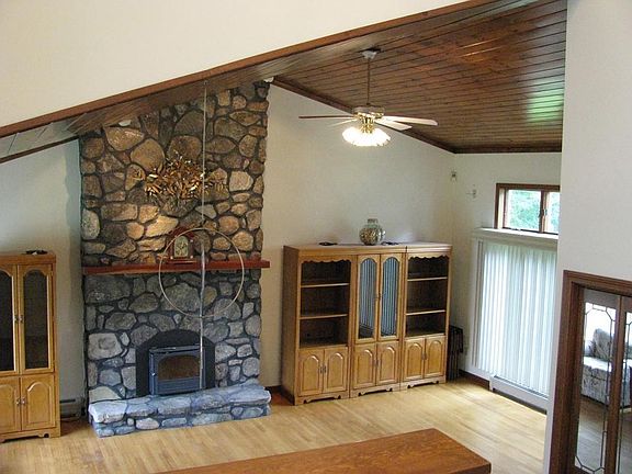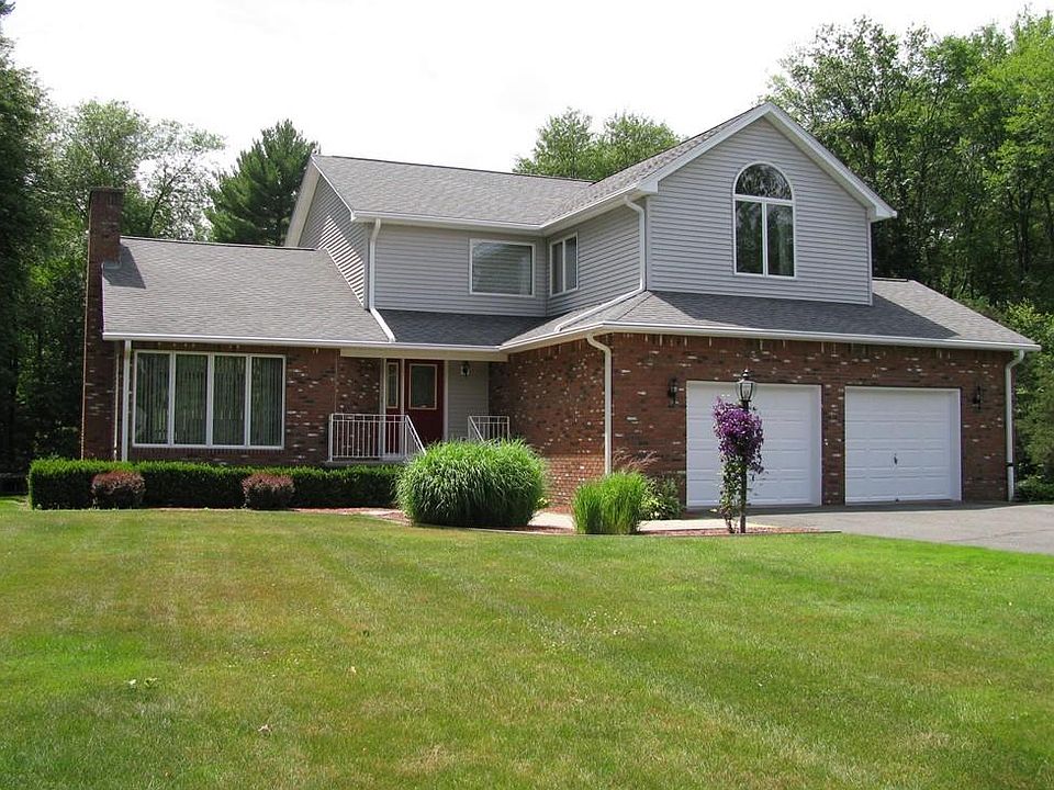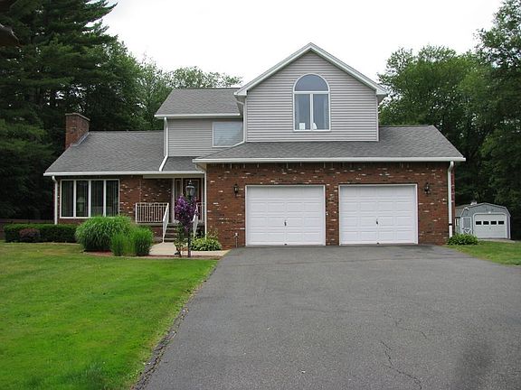 Two-story foyer welcomes you to this well-maintained Contemporary surrounded by mature landscaping in a quiet neighborhood. Great Room and master bedroom feature soaring pine ceilings. First floor laundry and half bath. Whole house wired for sound. Great room showcases floor to ceiling fieldstone fireplace fitted with Vermont Castings wood stove and a great expanse of floor to ceiling windows. Family room with wood stove leads to the sunroom off the deck which sports a 3-person hot tub. After you spend time in the garden, clean up in the outdoor shower. Easy exterior maintenance with vinyl siding, leaf guard gutters, and sprinkler system. Security system. Whole house fan. 14'x24' Klotter Farms shed for all your tools and projects - wired for electric, phone, and security. Cold storage room in basement. Appliances remain. Easy commute to Mass Pike. Come see this beauty.