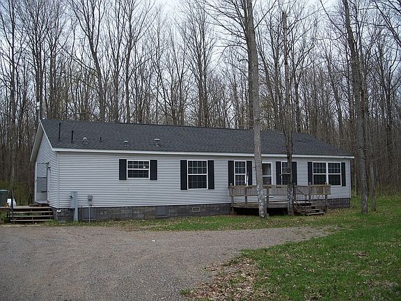 Beautiful home on over 56 acres. Hunting, fishing, snowmobiling, skiing, all within minutes of the front door. City water, electric (200 amp). Kitchen has ample cupboards and island with storage done in maple wood. It opens to a dining area with more cupboards. Living room has built in bookshelves, space for television and more storage. The patio doors lead to a deck with a view of the surrounding woods. The master bedroom has a large walk-in closet. The attached master bath includes two sinks, garden tub, separate shower and cupboard for linens. Property is approx. 24 acres of woods and 32 acres of field. There is also a huge barn/pole bldg. with power.