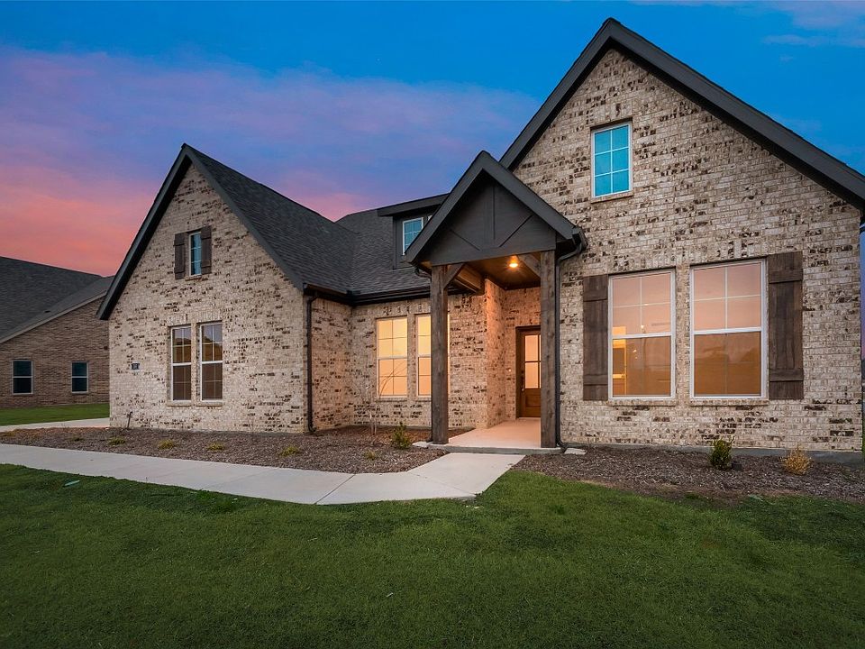 Energy Star Certified home with spray foam insulation! Beautiful open concept kitchen and dining and living area with 10 ft. ceilings throughout, mudroom with barn door and utility sink, white chopped stone fireplace surround, 7 x 24-inch wood-like tile flooring, Separate shower with seat and tub in primary suite, built in cooktop and stainless-steel oven, Raised Panel Pure White painted cabinets with 3 CM SF Real Granite in kitchen and Utility and Sile stone quartz in baths, includes Study option with French doors!
