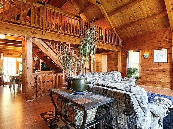 Six Acre Log Home Spectacular! If you've been waiting for something special, this is it! Unique & breathtaking home and property, complete privacy with mountain views, ideal location, just seconds from TSP. Two-story, 3 car detached garage with Dutch Barn provides perfect unfinished loft space with endless possibilities. Heart of the home great room and kitchen showcase dramatic vaulted and exposed beam ceilings, open floor plan with center isle with breakfast bar, and a Lopi Swedish pellet stove to keep the whole space toasty warm. Stunning Master BR ensuite and loft. Preferred kiln-dried log construction with built-ins, palladium windows, poured concrete foundation, exceptional finished basement with media and recreation rooms, and so much more. Extend your living space outdoors with a beautiful expansive deck, pergola, and 5 person Thermo-Spa hot tub. This is one of those very special homes that rarely come on the market. Act quick, and make it your own.