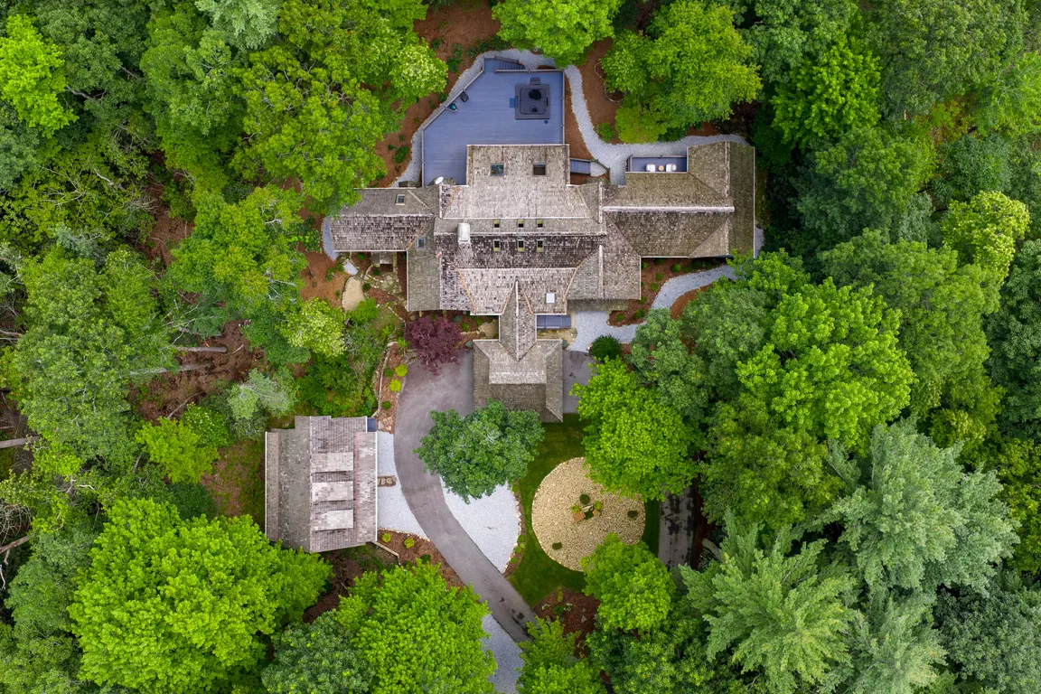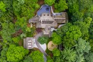 Custom wood doorsDetached oversized garageAttached guest cottageStone pathSoaring cathedral ceilingsFloor-to-ceiling custom cabinetryWalk-in shower