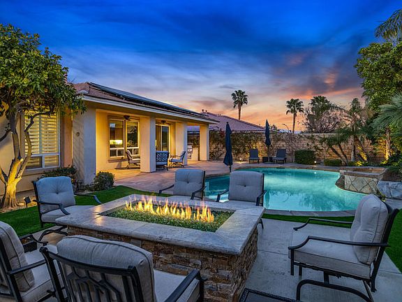 Private high-walled, south-facing residence is now available in the gated community Tuscany of Rancho Mirage. Notable features include: saltwater pebble tec pool and spa with waterfall and shelf; western mountain sightline view; attractive turf newly installed in backyard; open concept kitchen with stainless steel appliances; spacious primary suite with walk-in closet; two sizable guest bedrooms with convenient guest bathroom; financed solar system; natural gas extra-large custom outdoor fire table, bbq station under the covered patio, and climate controlled garage with AC and heating. Tuscany is a well-kept community with low monthly HOA dues, community pool, greenbelt areas, dog park areas, and is in close proximity to shopping and dining options.