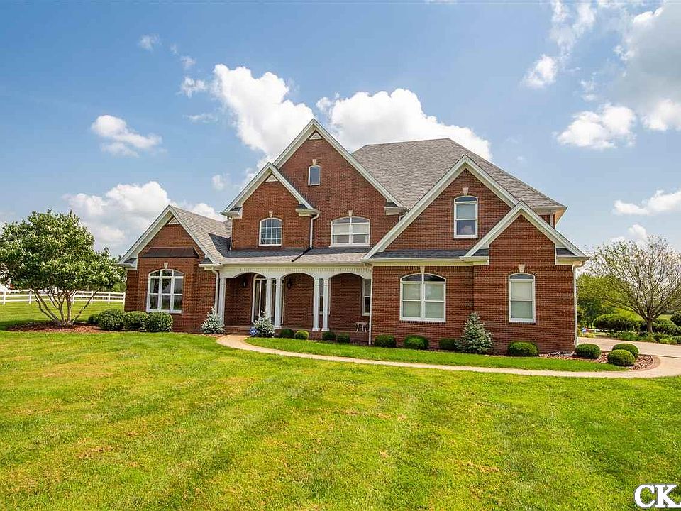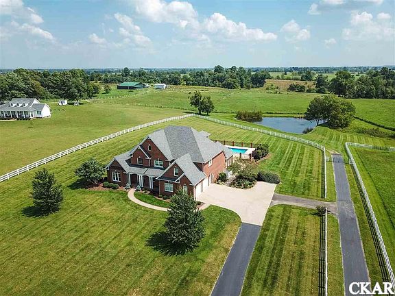 NEW PRICE. An immaculate home on almost 12 acres in the heart of the Bluegrass well sited on a rise that offers panoramic views of the countryside. Recent improvements and renovations include a new master bath, new hardwood floors, complete interior paint, new landscaping, some new fencing, several new light fixtures, 2 water heaters (50x80 gal), extensive pond renovation with new aerators, new washer & dryer, new window coverings and more. The property has 2 fenced fields of approximately 4 acres each with water and one field has a run in shed, ideal for horses. The pond is full of fish. The 16x34 heated inground swimming pool house with restroom. Other amenities include a gated entrance, security system, central vac, white panel fence, gas log fireplace, cherry cabinets and granite countertops. Owner financing available.