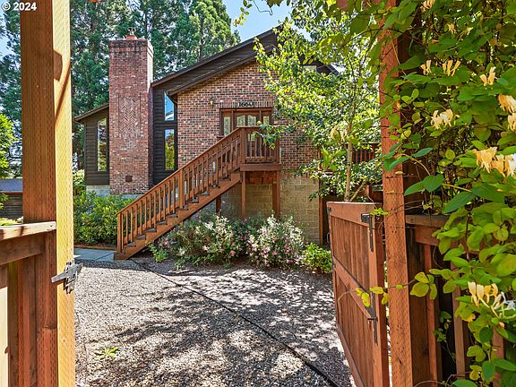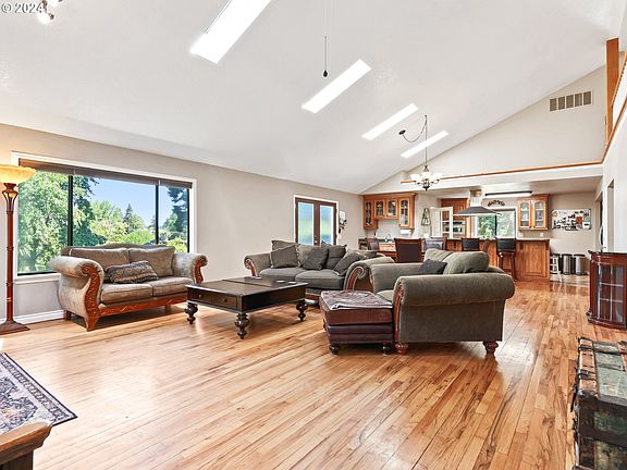 Welcome to this charming chalet-style home set on an almost quarter-acre corner lot. Large, private yard with beautiful landscaping and a tranquil atmosphere. Perfect for kids to play or adults to relax. Step inside to discover the inviting open-concept main living area highlighted by hardwood floors and a soaring vaulted ceiling. Get cozy with the floor-to-ceiling fireplace flanked by tall windows that bathe the room in natural light. Skylights complement both the living and dining area. The dining area offers a seamless flow to the back deck through french doors making it perfect for indoor-outdoor entertaining. A bar area with sink and mini fridge makes hosting a breeze. The gourmet kitchen features granite countertops, beautiful cabinetry, stainless steel appliances, an indoor grill and an eat-at bar. The main level is complete with a luxurious primary suite featuring hardwood floors, sliders to a deck overlooking the serene yard, double closets, and an updated private bath with a soothing jetted tub. A second bedroom and another updated full bathroom provide ample accommodation on this level that could be used for multi-generational living. The laundry room features a sink and access to the deck making it the perfect mud-room. Upstairs, two additional bedrooms, a full bathroom, and a versatile bonus area await, offering plenty of space for an office, playroom, or hang-out space. The unfinished basement offers potential for expansion and includes exterior access for added convenience. Outside, the expansive private fenced yard is a retreat in itself, featuring a detached workshop, a firepit, shade trees, and garden space for outdoor hobbies and gatherings. Located conveniently close to restaurants, schools, parks, and Vernonia Lake with its hiking trails, this home offers a perfect blend of comfort, style, and functionality.