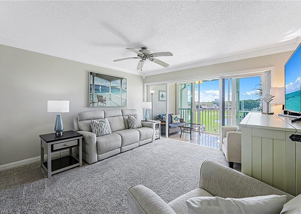 C12447. JUST ONE LOOK is all it will take to fall in love! Nestled in the highly desirable Seven Lakes Community, this meticulously maintained fourth floor condo features 1 bedroom and 1.5 bathrooms. TOP FLOOR means no upstairs neighbors; ideal for peaceful mornings and serene evenings. Loaded with upgrades, this unit has everything you’ve been looking for, including: an abundance of natural light, IMPACT RESISTANT windows and sliders throughout, NEW AC, decorative crown molding in living room and bedroom, and wait until you see the STUNNING golf course and lake views!!! The kitchen boasts bright white cabinetry, stainless steel appliances, and under cabinet lighting. The addition of a Queen Cabinet Bed (negotiable) in the living area, creates the perfect space for welcoming out-of-town guests. Purchase includes your very own GOLF CART and deeded golf cart parking space (covered)! Seven Lakes is a 55+ Bundled Golf community with incredible resort style amenities, including: 6 heated pools, fitness center, 6 Har-Tru tennis courts, pickle ball, bocce, wood shop, library, and so much more. Start living the life you have always dreamed of, in beautiful SW FL!