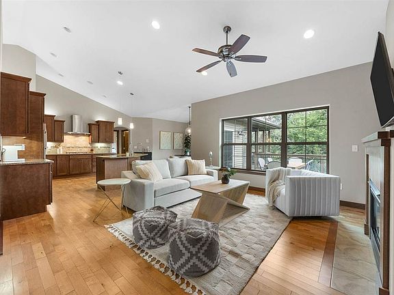 Wooded ranch home at the end of a quiet cul-de-sac in Cedar Springs. Warm and inviting, the open-concept design features 13-foot vaulted ceilings, rich wood floors, and fresh-painted walls. From the foyer, the living room opens to tree-lined views, anchored by a cozy fireplace with built-ins. The kitchen has brand-new GE stainless steel appliances, including a combination microwave/second oven, granite countertops, a center island, and a walk-in pantry. A sliding door leads to a fully refinished deck and screened porch with new screens. Just off the dining area is a private study with built-ins. The primary suite includes a dual-sink vanity, an 8-foot tiled shower, and a large walk-in closet that connects to the laundry room, which can also be reached through the mudroom. The walkout lower level is designed for entertaining. Large family room, 2nd fireplace, 11x14 wet bar with fridge, two bedrooms, full bath, and extra storage space. Outside, enjoy a covered patio that extends to an open area with a stone firepit, surrounded by mature trees, new sod, and expanded green space. Minutes to Coralville Lake, restaurants, and a short distance to the elementary school. Recent updates include partial roof and gutter replacements with guards after storm damage, along with a new garage entry door. New dishwasher in 2023.