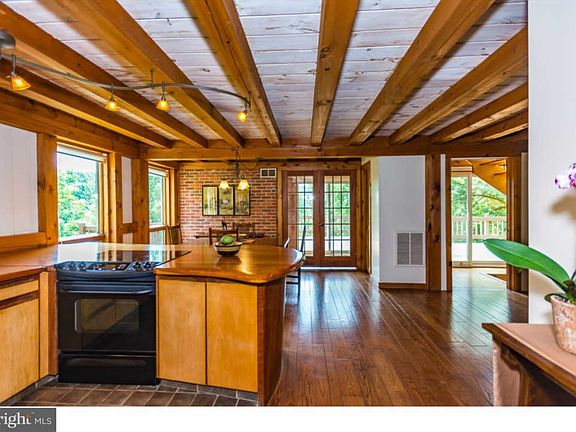 A short walk to the charming Village of Birchrunville, this unique cedar post and beam home on 5 acres provides arresting views from the 15 x 40 deck. The home's exposed beams, hardwood flooring, brick walls and fireplaces provide warmth and ambiance to the home's solid Timberpeg construction, and the passive solar design keeps propane heating costs to a minimum. A brick patio and mahogany door lead to a brick-floored mud room with access to the 2 car garage. The cherry wood kitchen was designed and custom built by a local fine woodworker. The dining area has a brick accent wall and French doors leading to a solarium with sliding door access to the deck. The living room features off-white bead board walls accentuating the post and beam construction, a wood stove and French door access to the staircase and deck. A full bath, coat closet and two pantries complete the main floor. The finished lower level features a spacious family room, brick wood-burning fireplace, built-in cabinetry and walk-out to the side yard. An additional room with tiled floor and French door egress provides the ideal space for a private office or 3rd bedroom. Retreat upstairs to the master bedroom with his and hers closets and a walkout to the balcony overlooking the view. A second spacious bedroom with two closets, a full bath and laundry complete the upper floor. Take comfort knowing the home is equipped with a full house generator. For the outdoor enthusiast, West Vincent Township offers endless opportunities for cycling, horseback riding, fishing, nature walks, and birdwatching. A very tranquil setting, yet convenient to premium shopping and major commuting routes (202, 422, 76).