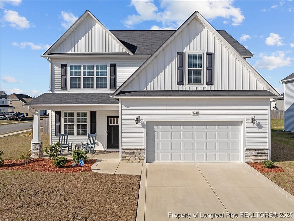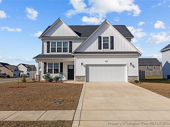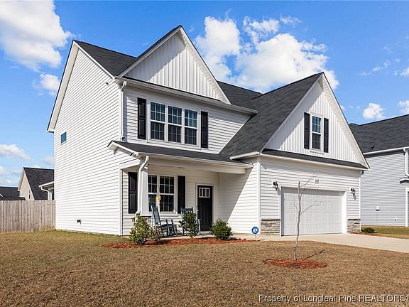 Gorgeous 2 Story 4 Bedroom, 3 Bath Home with Bonus! The Covered Front Porch has room for Chairs to enjoy your morning coffee. The Family Room with Ceiling Fan & Electric Fireplace separating it from the Kitchen & Dining Area is Great for Entertaining. Laminate Floors Thru out the common areas, Baths & Laundry with Carpet in the Bedrooms & Bonus. The Kitchen boasts Granite Counters, Tile Backsplash, an Island for meal prep or additional seating, SS Appliances & Breakfast Area. There is also a Guest Bedroom and Full Bath downstairs. Upstairs find your Primary Suite, 2 other Bedrooms, 1 additional Full Bath, Laundry Room and the spacious Bonus. The Primary Suite has a Trey Ceiling, WIC, Double Vanity, Garden Tub & Separate Shower. The Backyard has a Large Patio area with part covered to keep you out of the rain & part open for your Grilling time! There is also a Privacy fence with large double gate out back. Convenient to Ft Bragg, shopping & dining. Make your appointment today!