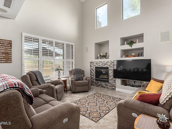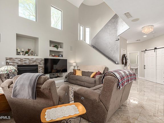 Contemporary & gated; RARE end unit in the highly desirable GATED community of McDowell Mountain Ranch. Near proximity to ''The Vig'', boutique restaurants and grocery store. City lights and views of Camelback from primary bedroom balcony. This is largest unit available having an open floor plan with vaulted ceilings, updated windows, plantation shutters, updated polished travertine (2018), updated LVP in the 2 primary suites upstairs. Additional den & 1/2 bath on main floor. Kitchen with gas range, designer lighting and breakfast bar. Dining area has built in buffet and fireplace in great room. Lots of counter space & additional storage under staircase. 2-car epoxy floor garage. Mounted Flat screen TV's convey with sale. Home Warranty paid by Seller up to $800 value. Sparkling community pool & fountain, spa, tennis courts & numerous amenities of McDowell Mountain Ranch just across the street. The Community boasts of biking trails, golf, all the dining and shopping in and around DC Ranch Beautifully maintained hard to find end unit. Smoke-free home. Living Room Furnishings available outside of escrow on separate bill of sale.