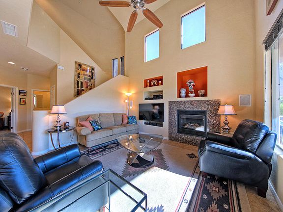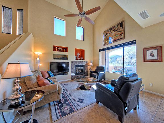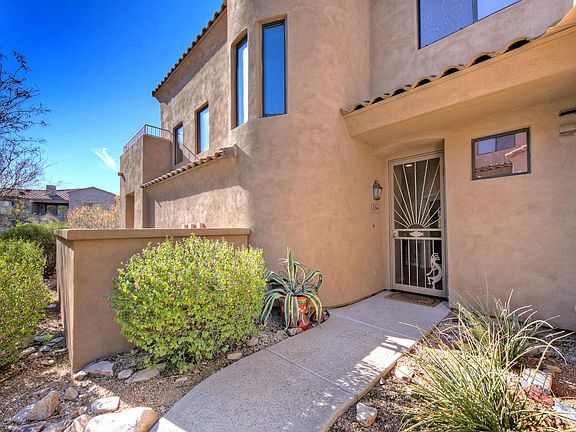 What an amazing setting in North Scottsdale! This is the perfect ''lock n leave'' town home, with TWO optimal south facing patios for lots of warm winter sun. Both of which back to the quiet common area with views of the McDowell Mountains from the upstairs balcony off the Master Bedroom Suite. As you enter this home, you are greeted with soaring ceilings and clerestory windows, bringing lots of natural lighting into the comfortable family room, with gas fireplace, decorative niches and surround sound system. This home has all the upgrades you need, including upgraded porcelain tile throughout the entire home (no carpeting), a beautiful custom stairwell, complete with large sunny windows on the landing, updated plumbing and lighting fixtures, alarm system, and custom ceiling fans