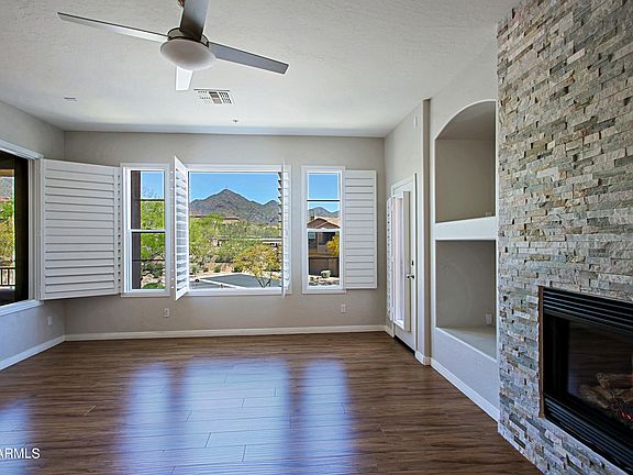 Enjoy stunning McDowell Mountain views from every room in this spacious 2 bedroom, 2 bath condo. Prime MMR location minutes from Westworld, TPC, hiking trails, golf, Aquatic Center, dining, shopping and the 101. Great room with stone fireplace, kitchen with quartz counters, stainless steel appliances and pantry. Upgraded unit with split floor plan (both bedrooms with doors to private balconies). Updates include new dual pane windows, plantation shutters, HVAC, hot water heater and more. End unit with direct access from 2 car garage with overhead storage racks. Gated community w/heated pool/spa, workout room and recreation room. Move in condition!