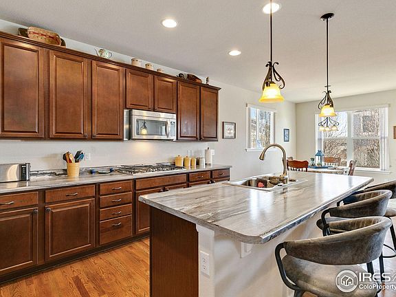 Bright and open floor plan! Meritage home builders go above and beyond with insulation. This quiet, meticulously maintained ranch style home is a must-see! Conveniently located in the highly desirable North Creek Farms neighborhood. Cooking and entertaining will be a delight in the gourmet kitchen which includes, island seating, stainless steel appliances, gas range, double self cleaning ovens, abundant storage, and pantry. Enjoy living spaces for all seasons; on the charming back deck, under covered front porch or in front of the warm gas fireplace in great room. The main level also includes the primary bedroom with 5 piece en suite bath and walk-in closet, a second bedroom, full bath, spacious office, and laundry room. The finished basement has a large bedroom, 3/4 bath with a walk in shower, huge family room and access to a large storage area. Some additional features include a 3-car tandem garage, oversized air conditioner, new exterior paint and much much more! Great location with easy access to shopping, dining, top golf, and grocery stores. Move in ready!
