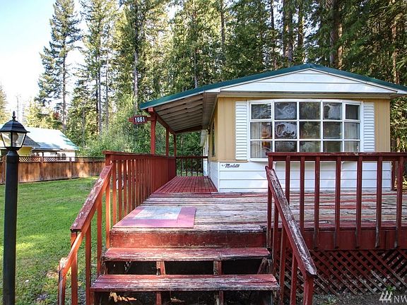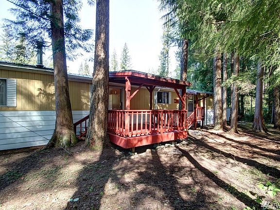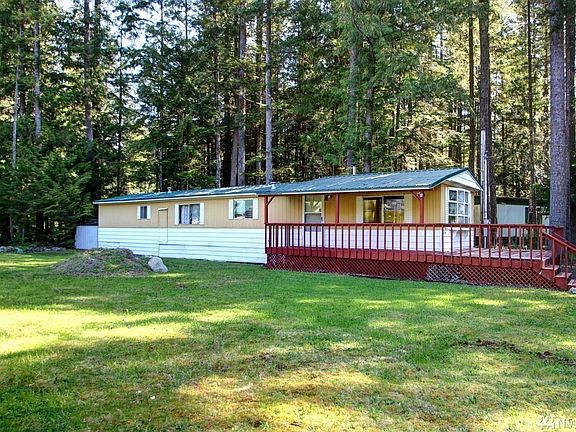 2 Bed 1 bath 1985 single wide mobile home located on a spacious piece of property featuring tall evergreens and situated next to mature forest. Mobile home with wrap around partially covered deck and metal roof, includes a wood burning stove and well placed windows that let in lots of natural light. Also on the property is a metal shed perfect for added storage.