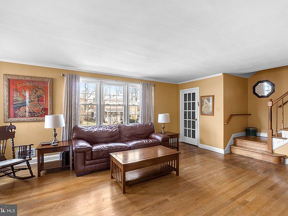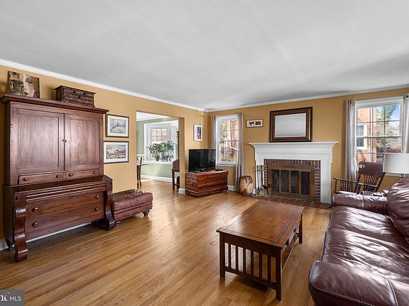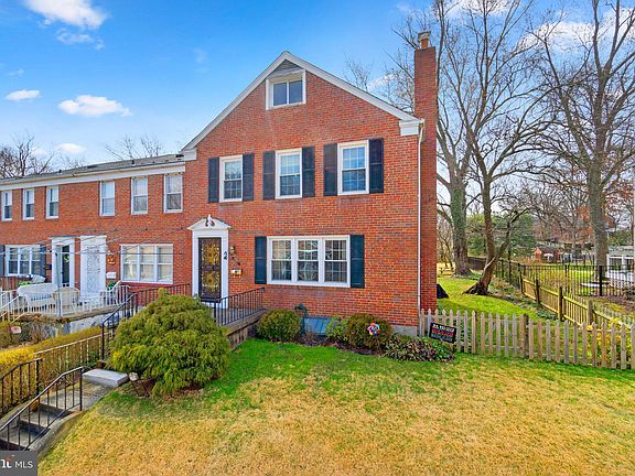 Natural light and space abound in this 4 level, 5 bedroom end-of-group brick townhome in Loch Raven Village boasting a front porch entry, refined crown moldings, rich hardwoods, a trio window in the living room centered by a wood burning fireplace, and a formal dining room accented by chair rail trim and brightened by a bay window. Airy and bright, the eat-in cook's kitchen offers plentiful polished wood cabinetry, gleaming beveled edge counters, tile backsplash with inlays, a full appliance package, a breakfast bar, and a back door to a covered deck. Wood stairway leads you to the 3 bedrooms all with hardwood floors. The master bedroom is quite large and airy. The second and third bedrooms are nicely sized with ample light and closet space. Moving up to the 3rd floor you will find two additional bedrooms with brand new carpet. Adding to the square footage is the finished lower level including a rec room with wood laminate flooring and a brick surround wood burning fireplace, a full bath, a laundry-utility room with a walk-up to the fenced yard, and extra storage. Nicely sized fenced backyard includes a patio, mature trees and foliage, pear, apple, and apricot trees, a garden shed, a play area, and access to the parking pad. Newer roof, newer windows, and recent whole house wiring. Convenient to shopping, dining, public transportation, Towson University, commuter routes, and all that Towson has to offer.