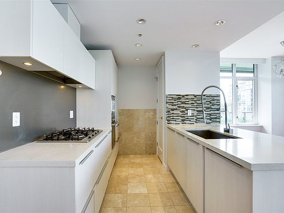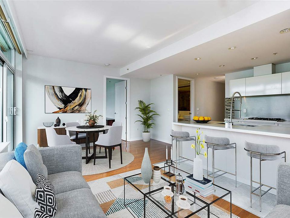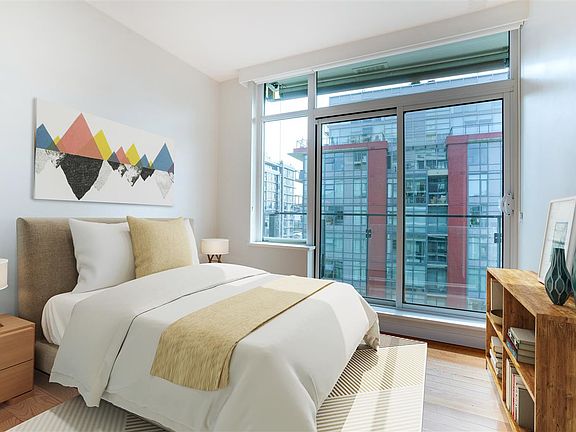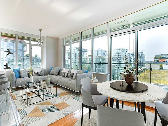 Welcome to this 2 bd corner suite with a wrap-around 226 sq.ft. balcony in The Sails building built with LEED technology! The kitchen features Miele and subzero appliances with quartz countertops. Exterior motorized shades and radiant cooling system inside are ready for those warm summer days! With world-class Gold Medal Club amenities featuring a hot tub, indoor pool, sauna and a gym, and Seawall steps away in Olympic Village, this is truly a great place to live. Pets and rentals welcome. See virtual tour and call for your private tour.