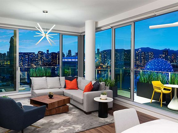 Stunning ocean, mountain & city views from this custom designed home by Kalu Interior Designs, located in the heart of Olympic Village. Gorgeous, contemporary, open concept living, complete quality millwork designed for efficiency & esthetic. The sparkling white kitchen with Bosch appliances, beverage fridge & island breakfast bar, address the dining & living space boasting beautiful feature wall housing media, storage & sleek, contemporary fireplace - perfect for cozying up on a blustery day. The bedrooms too are custom, the bathrooms serene. All lighting has been thoughtfully chosen for the space they are illuminating. Exquisite floor to ceiling windows bath your home in natural light, while spacious balconies are ideal for entertaining family & friends. Come enjoy, live your best life.