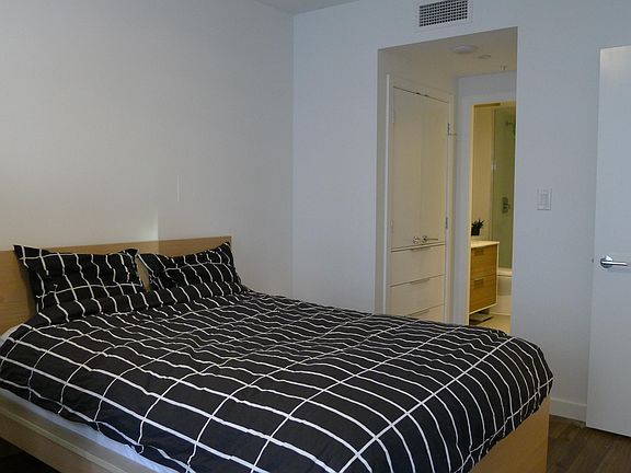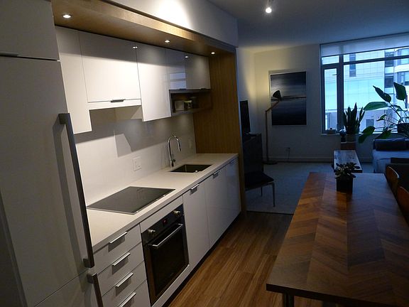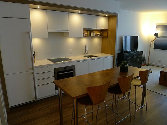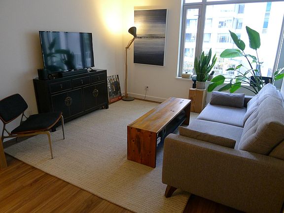 Clean, modern, quiet, spacious unit with high ceilings. Great location in Olympic Village, just steps to restaurants, shops, transit and the seawall. Sleek design with modern kitchen, heated bathroom floors and in suite laundry. Fully furnished and appointed with kitchen utensils, dishes, and linens, everything you need at a fraction of the price of other furnished suites or hotels. Owner pays for utilities, including high speed internet. This is a smoke free building. Absolutely no smoking permitted in the building or common areas. Visitor parking pass included (under 24 hrs). Additional parking may be available. Minimum 1 month rental, prefer 2 to 3 months