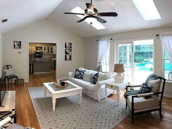 Open airy bright Northern style pool home with multiple French doors to screened tropical pool gardens and deck. Fenced back yard with large 2 level brick patio and professional landscape. Neutral painted interior. Brick floor to ceiling fireplace with flanking built in book shelf cabinets in family room. Mature tree landscape, sidewalks, well kept neighborhood, top rated schools, palladium arched window in valets selling master bath and custom mural above luxurious claw foot tub. Walking distance to top rated Woodland Elementary school (back door) and a short bike-ride away from Rock Lake Middle school. Pictures show staging, property comes unfurnished. No smoking, small pets allowed with pet deposit. Tenant is responsible for all utilities, pool and yard upkeep.