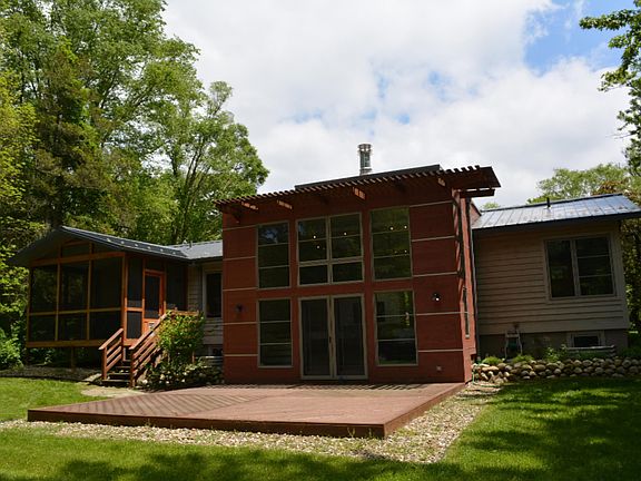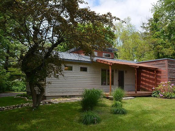 This sunny, open recently rehabbed home is a fooler from the street. Enjoy 5 bedrooms, 3 up and 2 down with 3 full baths. Approx 3200 sq ft. 2 huge entertainment areas, one with fireplace and vaulted ceiling w skylights. Stunning Marvin windows flood the home with natural light. Cedar siding. Beautiful wooded .7 acre lot. Screened in porch.Energy conservation features include: earthlinked geothermal heating/cooling, Marvin integrity windows/doors, rain screen exterior walls w R-19 insulation, cool roof with R-35 insulation, rain water recapture. Lower level all new with tile floors, 2 large bedrooms, beautiful new stone steam shower (need to add vanity, toilet and faucets). The perfect combo: new home but get to pick kitchen of your choice. Walk/bike to nearby township beach.