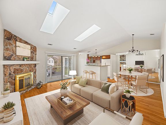 Turnkey, updated, and perfectly located! This beautifully remodeled 2nd-floor coach villa delivers bright, open living with true maintenance-free convenience. large expanded kitchen with granite counters and stone backsplash and breakfast bar flows seamlessly into the living room, creating an ideal layout for everyday living and entertaining. Enjoy vaulted ceilings in every room, skylights, and gorgeous hardwood floors throughout, plus floor-to-ceiling stone fireplace as your living room centerpiece. A full-size laundry room, generous closets, updated hall bath, and fresh paint make this home completely move-in ready. The spacious primary suite features a walk-in closet and a relaxing full bath with a soaking tub. Major updates include furnace (2018) and water heater (2020) and windows (except patio door), professionally painted 2025. You'll also love the private garage with storage and ample guest parking, brand new balcony redone by HOA (no special assessment) . Close to shopping, dining, and commuter routes-and served by top-rated, award-winning schools. Call it home for the holidays-don't miss this one!
