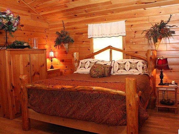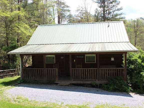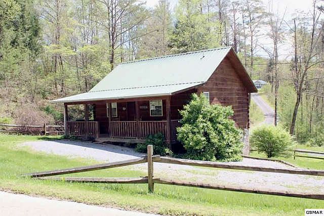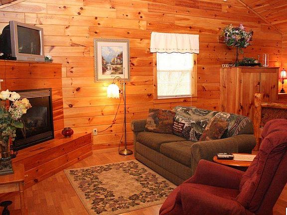One bedroom studio cabin in private, park-like setting about 5 minutes from the Parkway in Pigeon Forge. This cozy getaway has easy access and is close to area restaurants, shopping, golfing and Dollywood. There is a gas fireplace for snuggling, cathedral ceiling, wood floors, sofa sleeper, fully equipped kitchen, king sized log bed, whirlpool tub and full bath with shower. Relax on the porch swing or soak in the hot tub. This one level cabin has one step to the front door, easy paved road to the cabin, a flat gravel parking area and a flat to gently sloped grassy yard.