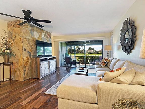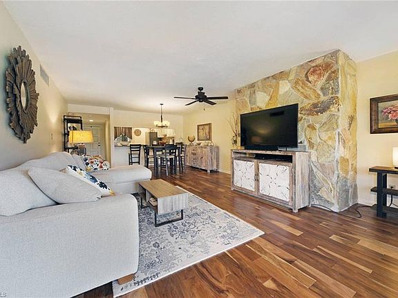 Price Adjustment! Beautiful, Ready To Move In, first floor 2BR/2BA end unit in The Forest, a Gated Golf and Tennis Community. Enjoy picturesque views of the golf course, including a water view and beautiful western sunsets. Freshly painted, Newly renovated bathrooms, Wood floors in living room and bedrooms, with tile in all other areas. Includes a Woodburning Fireplace and Impact Resistant Windows. The large screened and tiled porch add a tranquil and relaxing atmosphere to Florida living. The Forest Clubhouse is being renovated and currently under construction. Memberships are not required, however options are offered. Great investment opportunity or call this place your home! This condo is well maintained, Schedule an appointment to see!