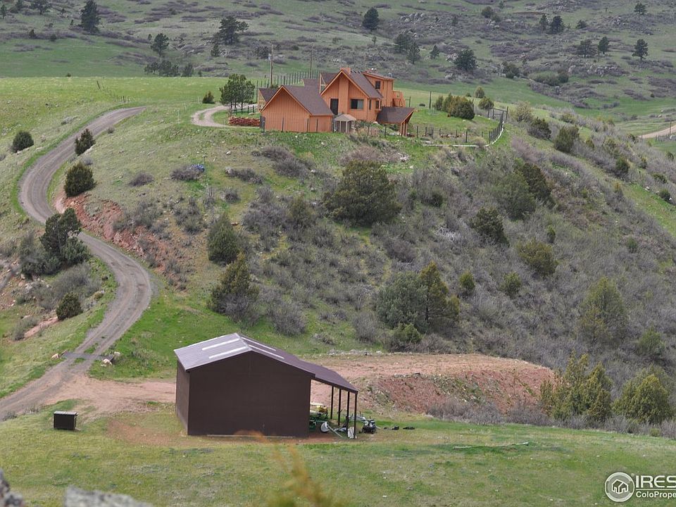 46 acres of social distance. Self sustaining features include well, propane, septic, cold storage, generator. Chicken coop, garage and shed. Spectacular King of the Hill type of setting directly west of Horsetooth with views of Horsetooth rock, redstone cliffs, meadows. Ideal private setting yet easy commute. Enjoy the creek and wildlife. New roofs on house and garage. Rise High speed internet low 40's mb. Interior features include charming Rustic Lodge ambiance, private master suite with balcony, beautiful repurposed wood doors, family room theatre, custom flowered tile in kitchen, induction stove, new dishwasher, built in book shelves.