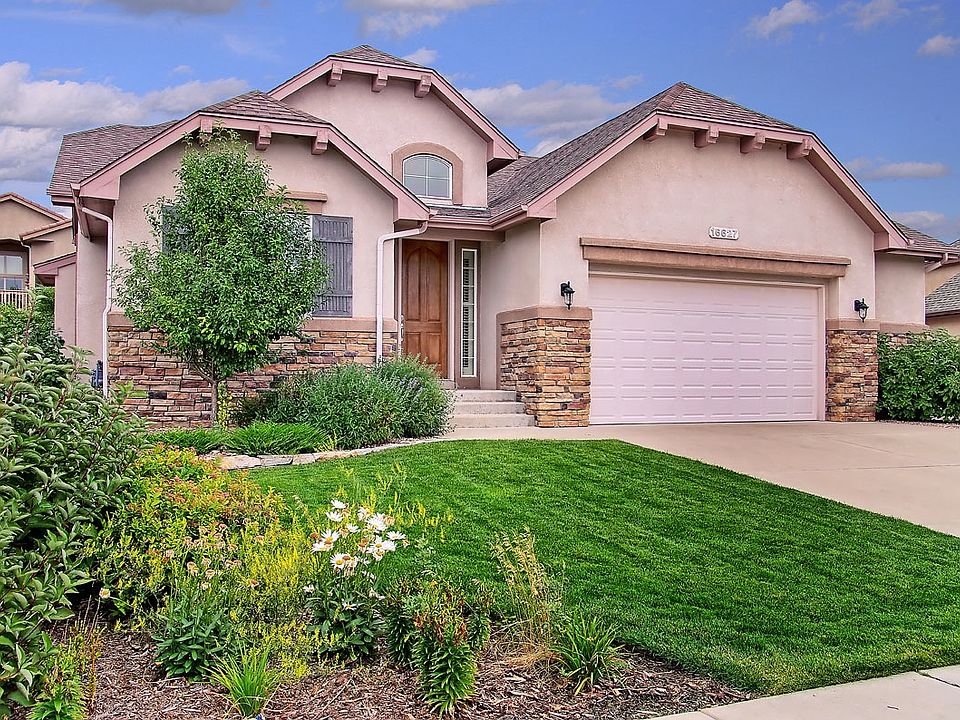 A truly wonderful Monument home with main level living! The original owners have meticulously cared for this Saddletree home. The upgrades are spectacular and include hardwood floors, upgraded fixtures and lighting, custom cabinets, granite and tile counters, professional window treatments including plantation shutters, wrought iron railing, finished 2 1/2 car garage, upgraded stainless steel appliances and more! The gorgeous master bedroom has a sitting room perfect for relaxing after a long day. Prepare to be impressed! You are sure to be love the large backyard patio with a large pergola, bubbling rock water feature, stamped concrete and stone steps with iron rails. Beautiful stucco and stone exterior. Professionally landscaped front and back. Convenient main level laundry room with a sink. The second bedroom on the main level can be used as an bedroom or office. You will love the huge basement with a nicely detailed wet bar and cabinets. There is plenty of room for storage in the utility room area. Located in a great neighborhood with beautiful mountain views and close to everything including easy access to I-25 for a commute to Denver, Colorado Springs or military bases. Welcome home!