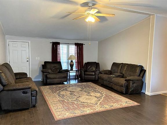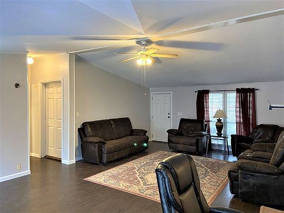 3 BR, 2 BA on 1.07 acre lot with fully fenced front and rear yards. Large great room with dark walnut laminate flooring, vaulted ceiling and wood burning fireplace. Eat-in kitchen features new laminate flooring, butcher block countertops, freshly painted cabinets, moveable island with breakfast bar and SS appliances to include refrigerator. Large owner bedroom has walk-in closet and extremely spacious owner bath with garden tub, separate shower and his hers vanities with ample counter space. Laundry room with built-in cabinets. Additional bedrooms also feature walk-in closets. Guest bath has tiled walk-in shower and ceramic tile flooring. New paint throughout interior. Metal roof only 4 years old and HVAC 1.5 years old. Large tiered, front deck that is handicap accessible and additional back deck. Front yard is fenced with drive-through gate and separately fenced from rear yard. Single carport, double carport, 2 storage sheds and 12x24 shop. Separate fenced garden area in back yard.