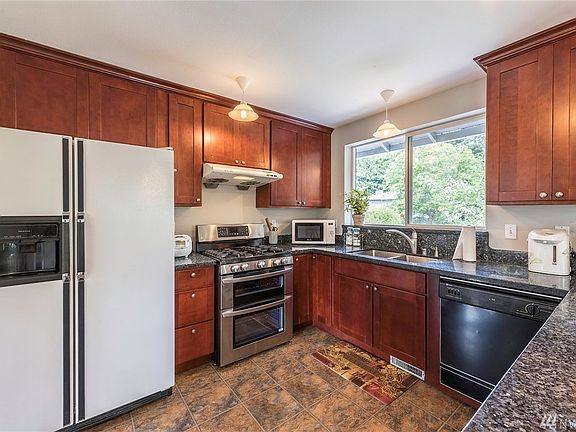 Gorgeously designed Home located in desirable Burien location! This home features NEW interior paint, bamboo flooring & lots of natural lighting throughout. The kitchen & BAs both contain wooden cherry cabinets w/ granite countertops which gives the home an exquisite look. There is an lovely glass chandelier that brings elegance to a formal dining rm that includes sliding glass door giving access to a beautiful yard w/ a grand deck, lots of beautiful trees & a pond. RV parking available!