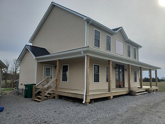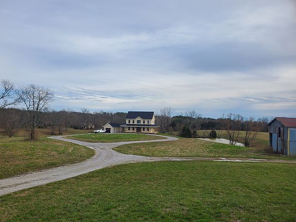 CALL 502-994-7888 This farmhouse style home was built in 2019 and sits on a 9+ acre lot including a large stocked pond and 50x60 barn. The kitchen has custom cabinetry with built in stainless steel appliances, a large island and granite counter tops. The first floor has 9 foot ceilings and consists of a beautiful entry way, dining room, kitchen/living/great room with a gas fireplace and an office space. The second floor has a large master bedroom with a second gas fireplace, beautiful view of the pond and backside of the lot, walk in closet, master bath with a soaking tub, shower and large custom vanity with two sinks. Also on the second floor are the two spare bedrooms which also have great views of a pond and a full bath in the hallway. The basement has 9 foot ceilings, theatre room and is finished with a storage/utility area. The great room has a great view of the pond and access to the wrap around deck with nice scenery on all sides. This home has 3/4 solid hardwood flooring throught the entire first floor, second floor hallway and master bedroom. This home was insullated with spray foam, has a high efficient tankless water heater and two high efficient hvac systems. There is also a one car detatched garage and circular driveway.