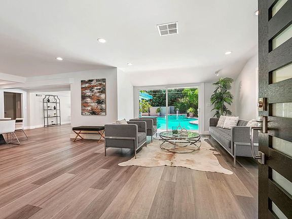 Set behind privacy gates in prime Encino Hills and in the highly coveted Lanai School District sits 16634 Calneva, a 4BR/3.5BA contemporary with mid-century influences, featuring abundant natural light, tremendous privacy, a freeform pool and spa, and some city views. Upon entering, the house opens to feature a great room with seamless indoor-outdoor flow. Natural light streams in through sliding glass doors, the updated kitchen w/ custom breakfast nook features a new Viking range, SS appliances, and storage galore. The perfect home office/Zoom Room w/ high ceilings and generous secondary BRs lead to a sumptuous primary suite w/ easy access to the pool and yard, two big walk-in closets, two extensively remodeled BAs w/ walk-in shower/steam room, and a gas fireplace. Updated flooring, recessed lights, tons of storage, a direct-access two-car garage, sophisticated landscaping and landscape lighting, and retractable Sunbrella awnings for hot summer days round out this prime offering, available just in time for end-of-summer fun!