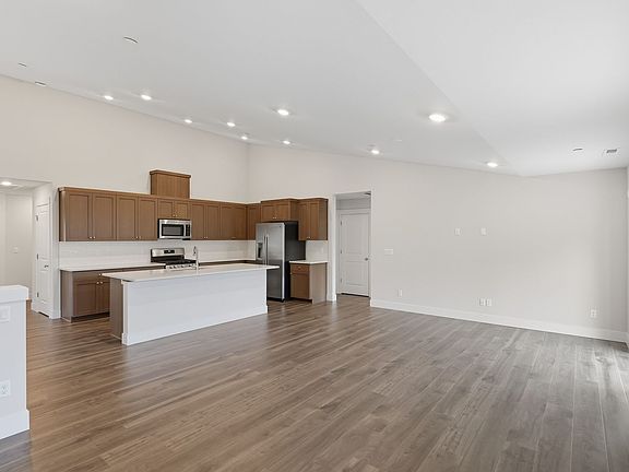 The main living area boasts soaring vaulted ceilings and an open-concept floorplan that seamlessly connects the living, dining, and kitchen areasperfect for both everyday living and entertaining.