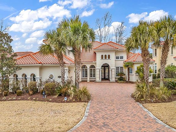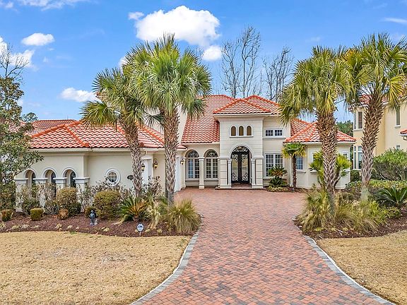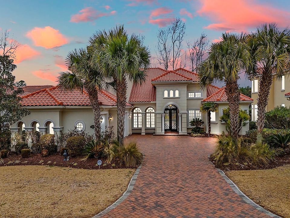 Welcome to your future dream home in the exclusive Grande Dunes neighborhood of Palermo! Nestled behind the neighborhood private gates, this stunning Mediterranean retreat awaits you. With 4 bedrooms and 4 baths, this home exudes elegance and comfort. As you step through the charming iron front doors, Italian Travertine tile floors guide you through the living, dining, great room, kitchen, and upstairs bedrooms and bath. The attention to detail is evident in the double tray ceilings, crown molding, and luxurious lighting that grace the entire home. The open concept living and dining area seamlessly transitions to the spacious great room, featuring soaring ceilings and a captivating brick facade centerpiece with a double fan. The gourmet kitchen is a chef's delight, boasting granite countertops, Kitchenaid appliances, and creme brulee glazed cabinets. A spacious pantry with craftsman wooden shelves adds a touch of practicality. The primary ensuite, part of a thoughtfully designed split bedroom plan, showcases Brazilian Cherry hardwood floors, a private wet bar with a wine cooler, and his and her closets with custom wooden shelving. The luxurious primary bath invites relaxation with a soaking tub adorned with a chandelier, a walk-through dual shower with multiple shower heads, including a rain shower head, and matching dual vanities. The smart toilet adds a modern touch to this private oasis. Downstairs also offers a bedroom ensuite and a private study with built-in cabinetry and closet, serving as a versatile space that could be used as a 5th bedroom with a full bath across. The staircase from the great room leads to 2 additional bedrooms and a full bathroom upstairs. Experience a seamless transition from indoor to outdoor living with a screened-in veranda and an outdoor kitchen featuring granite counter space and a gas grill. The private backyard offers serene water views, providing ample space if you wish to add a pool to this exquisite property. Outdoor access to one of the full baths downstairs enhances convenience for your outdoor living area. The storage areas are a nice asset for the property also! Upstairs a walk in storage area with plenty of room for excess furniture or holiday decorations. A huge bonus is the oversized 3 car garage WITH ADDITIONAL storage/work space. And don't forget the built in generator for the property! Recent additions to the home include Bidet toilet seats in all bathrooms (with a smart toilet in the Master), a TRANE split-type air conditioner, and a TESLA Wall Connector in the oversized 3-car garage. Don't miss this rare opportunity to own a piece of luxury in the prestigious Grande Dunes, complete with access to award-winning golf courses, The Marina, and the private Ocean Club. Your dream home awaits, seize the opportunity!
