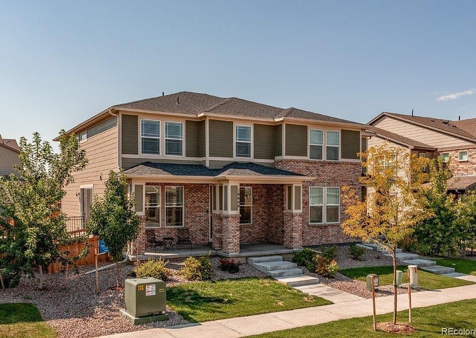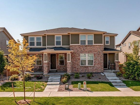 This Stunning Paired Home is Like New. Natural light pours in through the many large windows, creating a bright and welcoming feeling. Popular open concept floorplan is ideal for entertaining as well as everyday living. Gorgeous, engineered wood flooring graces the main living area. 9-foot ceilings, designer blinds, 6 panel doors and canned lighting throughout. Cooking will be a pleasure in the Gourmet's Dream Kitchen which features beautiful granite counters & large island with breakfast bar, an abundance of cabinets with crown molding, Whirlpool stainless steel appliances, including a 5-burner gas cooktop and a pantry. Host your friends in the expansive Dining Room & Great Room area. Sliding glass door opens to the fenced side yard. Master Suite has a lovely bathroom with marble topped dual sink vanity, chrome fixtures, tile flooring & huge walk-in closet. 2 additional bedrooms are nicely accommodated by a full bath with marble counter tops, tile flooring and an upper window which draws in the natural light. Loft Area is ideal for remote working or a homework space. Extensive future living space in the 768 square foot unfinished basement. Features an egress window, rough-in plumbing, high ceilings & tankless hot water heater. Convenient main floor laundry room washer & dryer included. bath with pedestal sink. Oversized 2 car garage has coated floor with professional paint. Wonderful location ~ a short walk to the neighborhood park & playground and acclaimed Global Village Academy. East Creek community is conveniently located minutes from E470 & I-225. Easy access to Downtown Denver, close proximity to excellent dining and shopping.