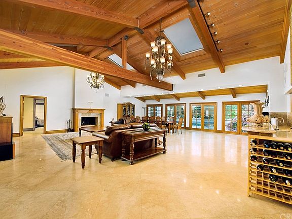 Built for the entertainer! Nestled on a quiet tree lined street sits this magnificent gated single level residence. Highlighted with stone floors, elegant detailing and luxurious finishes throughout! Upon entering through the double iron doors you will be immediately captivated by the grand living spaces adorned with towering vaulted ceilings, grand wood beams and dual cascading chandeliers! Lined along the wall of French doors is the expansive dining area with space to easily entertain well over 20 guests, or belly up to the hotel styled wet bar, outfitted with wine/beverage refrigeration, ice maker and all your party essentials! At the heart of the home is the stunning chef's kitchen, outfitted with loads of custom cabinetry, granite counters, center island, Viking Professional appliances and Sub Zero refrigeration. Encompassing four bedrooms that includes sumptuous master suite with romantic fireplace, sitting area, spacious walk-in closet and luxurious spa styled bath with over-sized jetted tub, seamless glass shower with multi-head massagers and dual custom vanities. Step out and relax in the ultra-private rear yard, surrounded by mature landscape, numerous fruit trees and sparkling pool with LED lighting, wonderful entertaining venues and built-in bar with cooktop. Separate office/library area, whole home audio system, fully finished garage and countless extra details you will surely not want to miss!