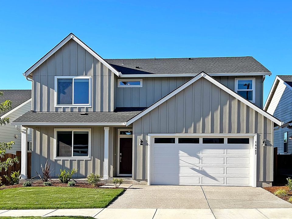 This move in ready, new construction two-story home is located at South River Terrace, a community near schools, shopping, dining, and freeway access, with its own park and sports courts. The Judith plan includes a main-level bedroom near the entry plus an expansive great room with fireplace, dining area, and kitchen that flow to a patio. Upstairs, three additional bedrooms, a bonus room, and the private primary suite with a soaking tub and walk-in closet complete the layout. Interior details include quartz countertops, upgraded arctic grey shaker-style cabinets, LVP flooring, two-tone paint, and a separate tub and shower in the primary bath. This home also includes central air conditioning, a refrigerator, washer and dryer, and blinds—all at no extra cost! Located on homesite 60. Rendering is artist conception only. Photos are of a similar home, features and finishes will vary.