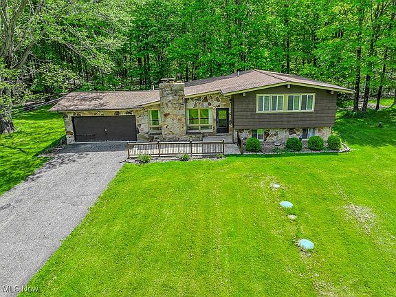Set back over 500' on a private, wooded 4.5 acre lot, this wood & stone, 5 Bedroom, 2 full Bath 3-level Split has a large unfinished basement as well. The Main floor features the Living Room with a stone faced, raised hearth wood-burning fireplace, efficient Kitchen with laminate floor, Dining Room with a slider to the rear porch overlooking the wooded back yard and a spacious Gathering/Flex area. The Lower Level has a large Family Room with many windows, Bedroom 5, Laundry Room and a roughed-in half Bathroom. The Upper Level has the Primary Bedroom with a walk-in closet and private bathroom, 3 additional Bedrooms and the main Bathroom. There is a large unfinished Basement that offers great storage and potential for additional finished space. This beautiful 4.5 acre property features a large meadow-like front yard with a stamped concrete front entrance Patio and and a fully wooded back yard. Enjoy being close to LaDue Reservoir and Rt 422 and within the award winning Kenston School District.