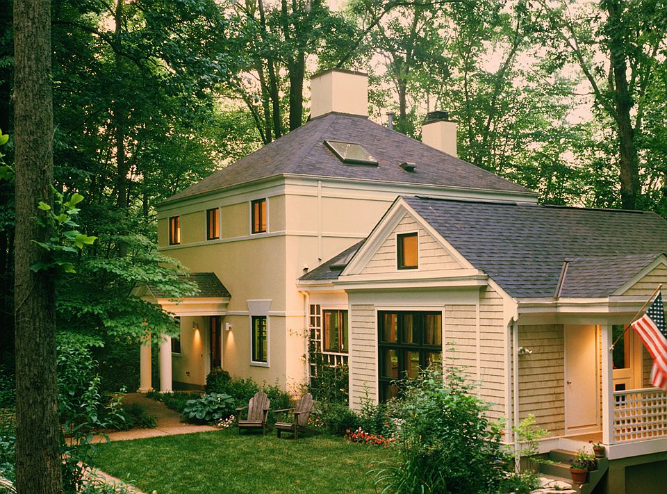 Classical-styled center section in stucco with slate-roofed entry porch. Large windows look outward to wooded area and stream. 1997 Kitchen/Family/Dining wing with wood shingled exterior walls.