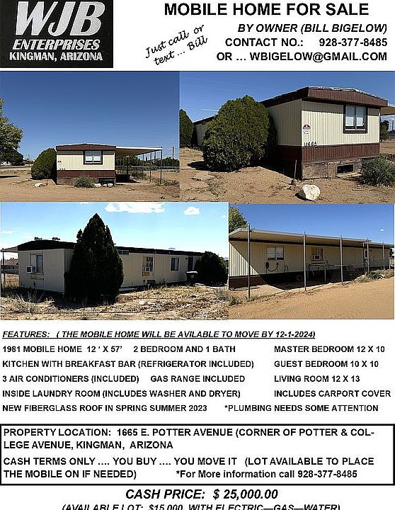 Mobile home for sale. $15,000 for the mobile home. You move it to your lot or mine. Lot for sale for $10,-000. if sold with mobile. Lot located at 3850 E. Northfield Road, Kingman, Az 86409