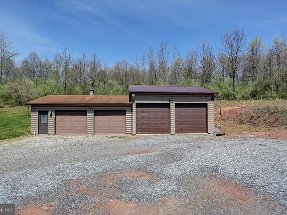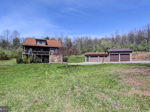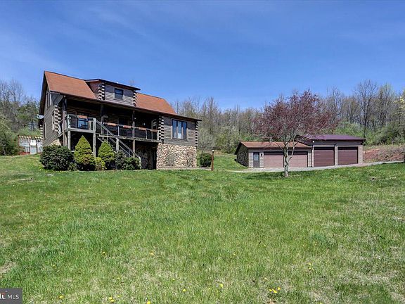 This log cabin embodies the essence of mountain living, with paneled wood walls and beamed construction. Connect with nature on 11.9 acres of privacy; wood and open spaces and trails that welcome deer, turkey & eagles. Two story vaulted ceiling in living room with overlooking balcony off 2nd floor, wood and cathedral ceilings, open living/dining room with large windows. Eat-in kitchen with center island with granite countertop, pantry and stainless steel appliances. 2 bedrooms and full bath on mail level. Upper level has private master suite with beamed cathedral ceiling, full bath, closet and built-ins. Balcony is perfect for a quaint work from home space. Lower level offers large family room with pool table (can convey or be removed) and unfinished space for storage/workshop with walkout. Porch offers plenty of space for friends and family to gather with beautiful mountain views. Security system. 4 car detached garage (Garage #1 24x28 with 10" ceilings, 220 line, openers and shelving conveys Garage #2 28x24 with openers, propane heat and boat storage. Large shed. Near State Game Land, 30 minutes to Raystown Lake & Resort, few miles to fishing in Licking Creek, ATV Trails & hiking. Property is in Clean-In Green. Room sizes and sq feet are approx.