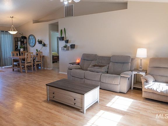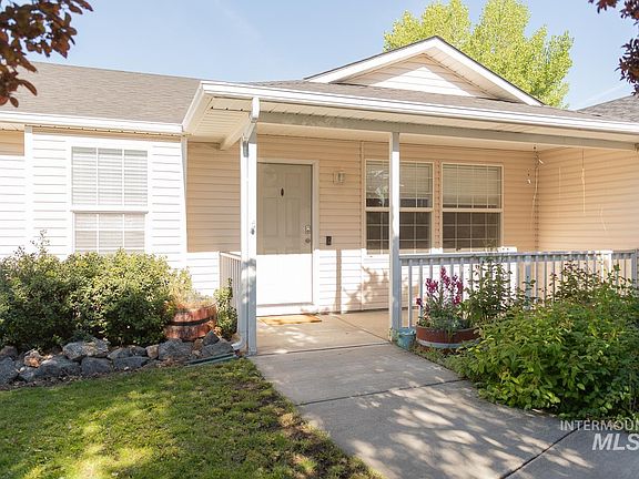 Excellent location and beautiful curb appeal! Come see this four bedroom home in the Mountain Ridge neighborhood. Vaulted ceiling in the living space make for a nice open feel. Laminate flooring throughout the bedrooms and living room. The kitchen has gas range, built in microwave, corner pantry, and breakfast bar as well as amazing natural light with two skylights. All appliances are included. Master bedroom boasts en-suite bathroom and walk in closet. This home has a great split floor plan with two bedrooms and a bathroom on one side and the master bedroom and one extra room on the other. The laundry room has a convenient utility sink and the washer and dryer are included. Relax on the back covered deck, take in those beautiful Idaho sunsets. Extra storage space provided by the shed and RV parking are a plus. This home has a newer roof that was installed July 2023 as well as a newer dishwasher, blinds and smart thermometer. Call today for an appointment!
