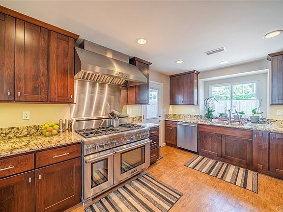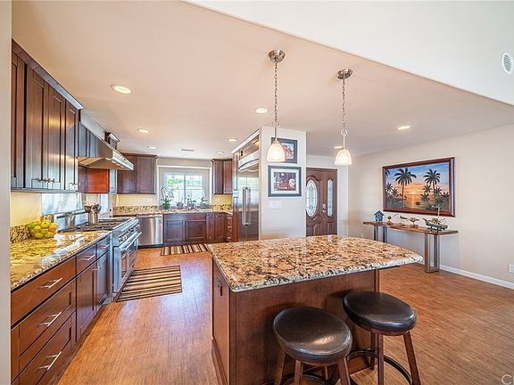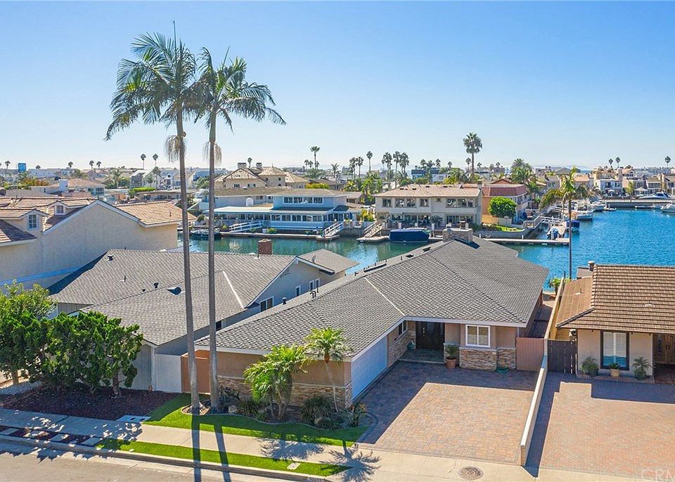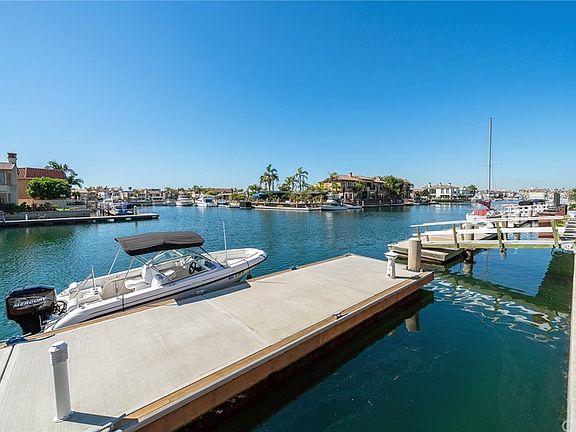 Soaring ceilings and tasteful decor greet you at the door. The open floor plan allows views of the sparkling Huntington Harbour waterways from almost every room. Outdoors, you'll enjoy 50 feet of water frontage and your very own private dock. This property was torn down to the studs and completely remodeled in 2012. It was also expanded to almost 2000 square feet of living space. The light and bright kitchen is equipped with Thermador stainless steel appliances, solid wood cabinetry, granite countertops, a breakfast island and wood-like tile flooring. A separate built-in wet bar is located in the living room and also features beautiful granite and solid wood cabinets. The high ceilings in the living room are accentuated by a floor-to-ceiling stack-stone fireplace. Step outside to the patio and enjoy another built-in outdoor fireplace.