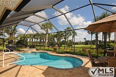 Magnificent upgraded Covington model with an impressive great room that has nesting sliding glass doors to your picturesque lanai. The sparkling pool and spa are framed by a raised pavered deck with irrigated planters and plenty of space for entertaining. This pristine home was specifically sited for the advantage of viewing the fairway, 1st green, and lake. Inside you'll find decorative columns framing graceful arches, upgraded cherry cabinets in kitchen and baths, granite counters, tumbled marble backsplash, stainless appliances, under cabinet & toe-kick lighting, crown molding, built-in speakers with volume controls in great room, MBR, office and DR, wood plantation shutters throughout, 18 inch tile on the diagonal, hardwood flooring in office and one bedroom, shelving installed above garage door for storage, plumbing and electric for outdoor kitchen, PLUS Sports Package Golf Membership equity contribution included with purchase. Click on the virtual tour button above to see if this is The One! Brokered And Advertised By: Right Choice Realty LLC Listing Agent: Kevin Patrick O'Keefe
