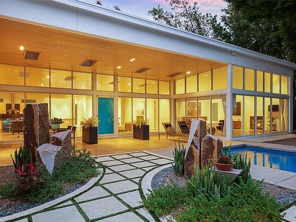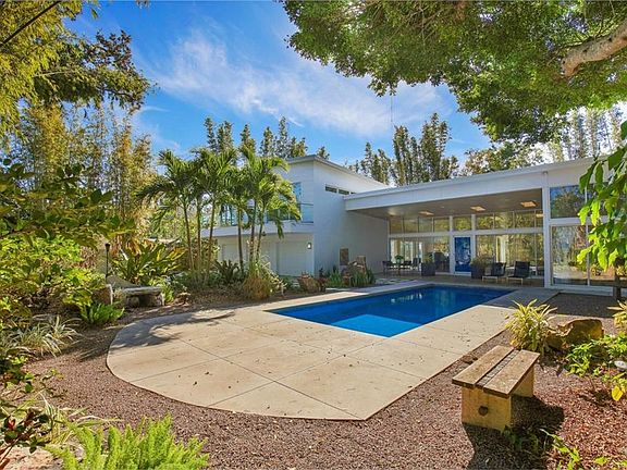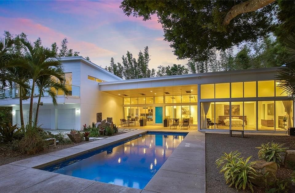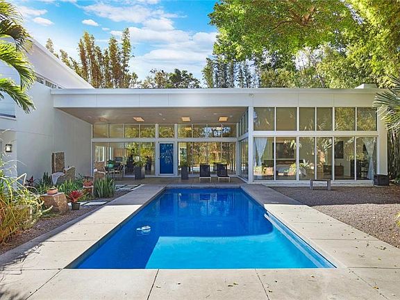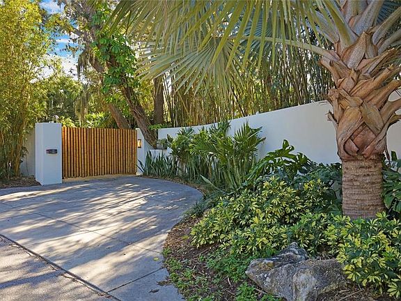 Walled, gated, incredibly private and just a few minutes from downtown Sarasota in the coveted West of Trail area, this three-bedroom modern retreat starts an exciting conversation with the outdoors through vast expanses of glass. Walk into a spectacularly open living space to find a continuation of washed pine tongue-n-groove ceilings, ethereal skylights, art gallery walls, substantial poured concrete floors and no shortage of architectural character. Entertain on a large scale or relax in solitude thanks to this versatile layout, which provides a smooth transition from space to space. A contemporary kitchen provides the focal point for casual dining at the breakfast bar, and features natural gas cooking from its GE range. The private swimming pool is your own secluded oasis, framed by intricately woven landscaping that inspires a feeling of pure Zen. A three-car garage is wonderfully convenient. You will not find a property with as much privacy in this sought-after area close to Sarasota Bay, Selby Gardens, Southside Village, Downtown, and adjacent to Harbor Acres.