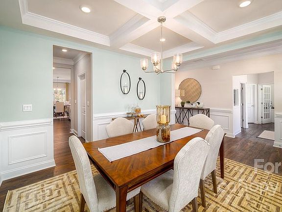 Hampshire plan formal dining room with a coffered ceiling open to the butler's pantry and large walk-in pantry closet. The kitchen has an island that has pendant lights with granite countertop with subway backsplash. Chef's Kitchen includes gas whirlpool appliance package Stainless includes gas cook top, built in dishwasher, OTR microwave and double wall ovens electric. The spacious Living room has a gas fireplace. Main flooring areas have extended Revwood flooring in main areas. First floor ceiling height 9ft with decorative molding two piece crown throughout first floor living area. Breakfast area looks out to the patio through the glass sliding doors. This home has a bedroom on the main level off the living room and steps away from the full bath down from the entry to the garage. The stairs are off the kitchen with open rails. Upstairs offers an open loft area off the Primary suite with sitting area. Model will be sold as-is, no furniture or decor, will be converted two car garage.