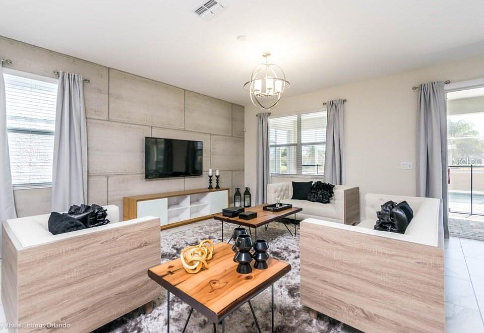 It is a MUST SEE HOME!!! Enjoy the lifestyle that you deserved on this beautifully furnished vacation home at Champions gate Community. This Amazing 8 bedrooms and 5 bathrooms, professionally decorated with luxury finishes and furniture. 2 Master Suites and 1 Guest Room upstairs, 2 First Floor Bedrooms. Open Floor plan has a generous sized kitchen, dining and family room. The kitchen is spectacular with its modern finishings, center prep island and all appliances are top of the line, including Washer and Dryer. Outdoor area with private pool and few steps from the Oasis Club Clubhouse and Water Park. Champions Gate is a fantastic guarded and gated community that has 18 hole golf course and 14,000 sq ft Clubhouse. Oasis also features a restaurant, bar, movie theater, fitness center, aerobics room, spa, arcade room, resort style pools and a lazy river along with a splash area.