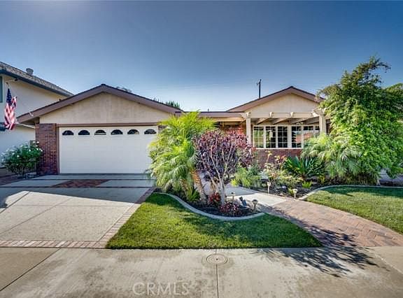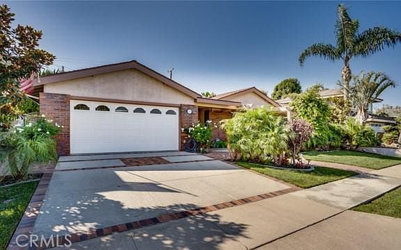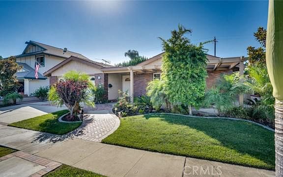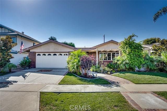 Fabulous interior tract location single story "Prestige" home with over 1,000 square feet of permitted additions. From the moment you drive up, you will be impressed with the exceptional curb appeal, including extensive hardscaping with brick trim, a front patio with lattice cover and nice landscaping. As you enter through the double doors, you are greeted by a large foyer with a skylight + a very spacious formal living room which were part of the additions along with the dining room which used to be a 4th bedroom. Then comes the kitchen which features updated countertops, plenty of cabinets, including a large pantry and a large eating area. Next comes the den/sitting room with a fireplace, built-in cabinetry and a skylight which flows into the family room addition offering a vaulted ceiling, built-ins and a French slider leading to the rear patio. The hall bath has a bathtub + an updated vanity. The rear left bedroom has been expanded as part of the additions. The primary bedroom is also located at the rear right and has been expanded to include a walk-in closet, a large bay window and a private primary bathroom with a walk-in shower and a skylight. Bonus features include; textured ceilings, ceiling fans, recessed lighting, panel doors, some dual pane windows, French sliders, tile flooring in the entry, kitchen, hall and baths, updated heating and air conditioning, rain gutters, drains and best of all SOLAR PANELS which are fully paid for and only 6 years old! The private rear yard features 2 lattice covered patios, a grassy area, nice landscaping, block wall fencing and there are front & rear timed sprinklers. This lovely home is located in an excellent award winning school district and is walking distance to a park, golf, shopping, restaurants + a 5 minute drive to the beach!