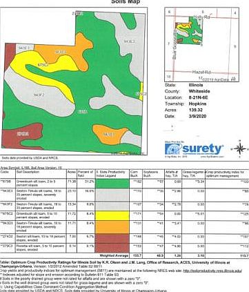140 acre farm with 122 acres of tillable land and 9.1 acres of CRP. Includes a building site with machine shed garage & livestock shed, grain bin, well and septic system. Well drained and productive soils.