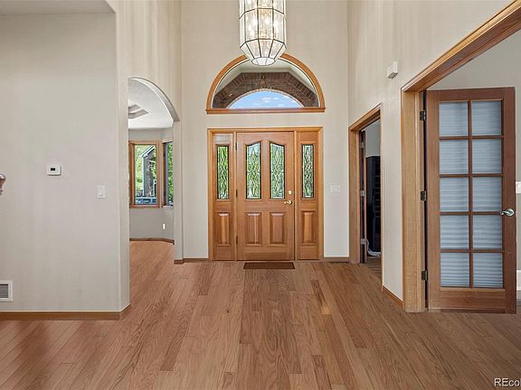 A custom-built home in the highly sought-after West Woods Golf Community, now available. This property sits on a large .32-acre lot that backs to the picturesque Ralston Creek Trail and West Woods Golf Course, providing breathtaking views and a serene environment. As you step into the house, you'll be welcomed by a grand formal living room with a dramatic high ceiling, a curved wall of windows, and a wall niche, creating a perfect first impression. The formal dining room is impressive with coffered ceilings and bay windows, making it an ideal space for hosting elegant dinners and gatherings. The gourmet kitchen is complete with mission-style cabinets, slab granite countertops, a kitchen island, a Sunroom or eating space, and desk area. Adjacent to the kitchen is a large family room with built-in bookshelves, a gas log fireplace, and hardwood floors. The main floor primary bedroom is a retreat with vaulted ceilings, a gas log fireplace, a walk-in closet, two separate vanities, a jet-action oval soaking tub, and a shower. The main floor also features an office/den with built-in bookshelves, a gas log fireplace, and bay windows, providing a comfortable workspace. The upper-level features 3 spacious bedrooms and a loft with built-in bookshelves. One of the bedrooms has an attached full bathroom, and a private balcony, while the other 2 bedrooms share a jack-n-jill bathroom with each bedroom having its own vanity. The finished walk-out basement provides additional living space with a fireplace, a second full kitchen equipped with mission-style cabinets, a huge pantry/prep area, a stove/oven, and a dishwasher. The basement also features a walk-in climate-controlled wine cellar, a full bathroom which includes a large walk-in shower with bench seating, and a garden room.